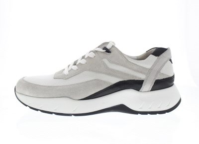 Sportieve heren casual sneaker van Gijs met een extra dikke dempende Mark afwikkelzool die neutraal afwikkelt, waardoor dit een zeer goede alledaagse schoen is voor de lange en korte wandelingen. Het type 2070 heeft een unieke afwikkeling die je actieradius bij het lopen vergroot door een zoolverstijving, samen met een hippe look wordt de peesplaat ontlast en vermindert pijn bij artrose. Wit/lichtgrijs suède gecombineerd met glad leer. Wijdte H, geschikt voor de iets bredere voet. Uitneembaar voetbed.