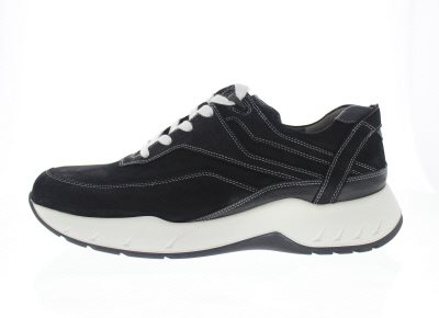Sportieve heren casual sneaker van Gijs met een extra dikke dempende Mark afwikkelzool die neutraal afwikkelt, waardoor dit een zeer goede alledaagse schoen is voor de lange en korte wandelingen. Het type 2070 heeft een unieke afwikkeling die je actieradius bij het lopen vergroot door een zoolverstijving, samen met een hippe look wordt de peesplaat ontlast en vermindert pijn bij artrose. Zwart nubuck leer. Wijdte K, geschikt voor de brede voet. Uitneembaar voetbed.