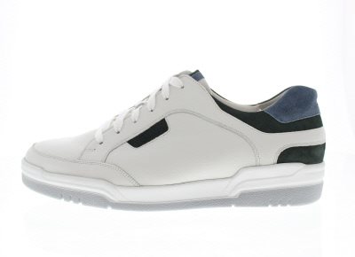 Gijs casual heren sneaker, model 2135K. Voorzien van een comfortabele Rob rubberen loopzool met een flexibel neutrale afwikkeling. De stevige contrefort zorgt voor een goede enkelstabiliteit. De hielheffing ondersteunt een geïrriteerde achillespees. Wit glad leer met blauwe details. Wijdte K, geschikt voor de brede voet. Uitneembaar voetbed. Hakhoogte 40mm. Hielheffing 23mm. Impregneren met Collonil Carbon Pro voor het beste resultaat