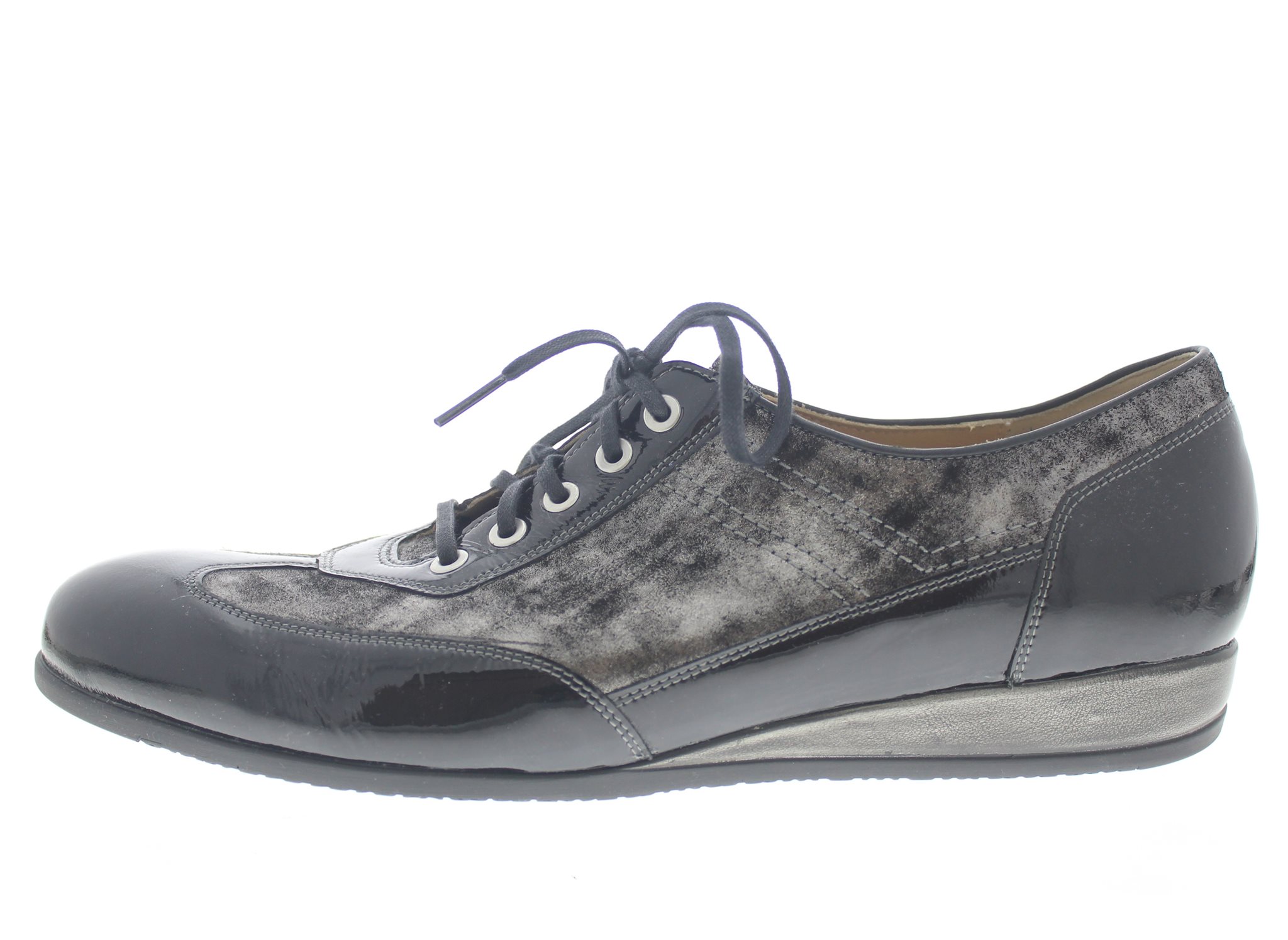 Durea dames veterschoen, model 6143E. Soepele schoen met een flexibele zool. Elegant met lakleer en metallic nubuck. Wijdte E, geschikt voor de smalle voet. Uitneembaar voetbed.