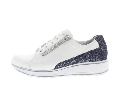 Mooie sneaker model van Durea is gemaakt met een afwikkeling in de loopzool. Het voetbed is uitneembaar en de wijdte van deze schoen is K. De hakhoogte is 38mm en de hieldrop 20mm. Deze leren schoen is uitgevoerd in wit met blauw.