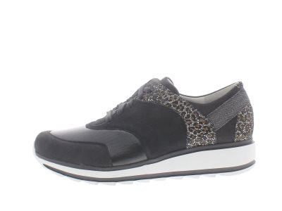 Durea casual dames sneaker op een Sophie afwikkelzool voor extra loopcomfort, model 6225H. Zwart nubuck leer met een stiknaden vrije gedeelte van meeverend neopreen rond de balwijdte van de voet. Dit ontlast de voorvoet van druk bij een hallux valgus, bunion, hamer en klauwtenen. Wijdte H, geschikt voor de iets bredere voet. Uitneembaar voetbed.