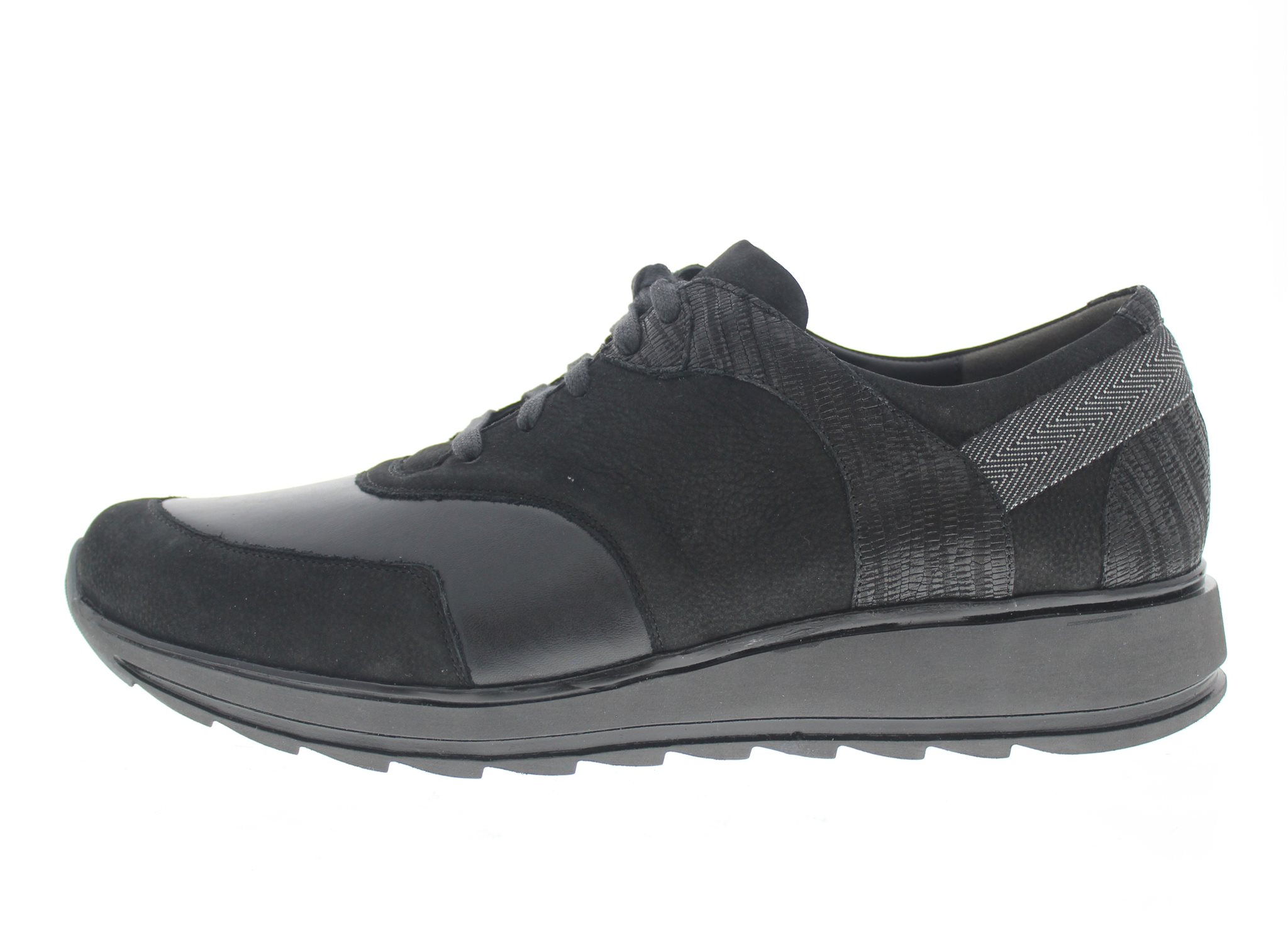 Durea casual dames sneaker op een Sophie afwikkelzool voor extra loopcomfort, model 6225H. Zwart nubuck leer met een stiknaden vrije gedeelte van meeverend neopreen rond de balwijdte van de voet. Dit ontlast de voorvoet van druk bij een hallux valgus, bunion, hamer en klauwtenen. Wijdte H, geschikt voor de iets bredere voet. Uitneembaar voetbed.