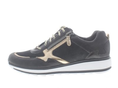 Durea casual dames sneaker, model 6261K op een Sophie verstijfde afwikkelzool voor extra loopcomfort door een vervroegde afwikkeling. Ontlast daardoor voorvoet gerelateerde klachten, en een stevige contrefort voor een goede enkelstabiliteit. De hielheffing ondersteunt een geïrriteerde peesplaat en achillespees. Zwart leer met neopreen en gouden details, en een functionele rits voor het instapgemak. Wijdte K, geschikt voor de brede voet, en een uitneembaar voetbed.
