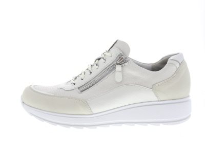 Durea casual dames sneaker, model 6263H op een Sophie verstijfde afwikkelzool voor extra loopcomfort door een vervroegde afwikkeling. Ontlast daardoor voorvoet gerelateerde klachten, en een stevige contrefort voor een goede enkelstabiliteit. De hielheffing ondersteunt een geïrriteerde peesplaat en achillespees. Licht wit/taupe suède gecombineerd met glad en metallic leer, met een rits voor het instapgemak. Wijdte H, geschikt voor de normale tot iets bredere voet. Uitneembaar voetbed.