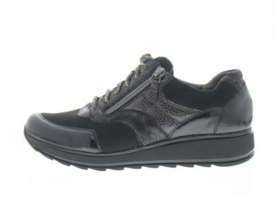 Durea casual dames sneaker, model 6279K op een Sophie verstijfde afwikkelzool voor extra loopcomfort door een versnelde afwikkeling. Ontlast daardoor voorvoet gerelateerde klachten, en een stevige contrefort voor een goede enkelstabiliteit. De hielheffing ondersteunt een geïrriteerde peesplaat en achillespees. Zwart leer met een stretch voorblad. Voorzien van een functionele rits voor het instapgemak. Wijdte K, geschikt voor de brede voet. Uitneembaar voetbed.