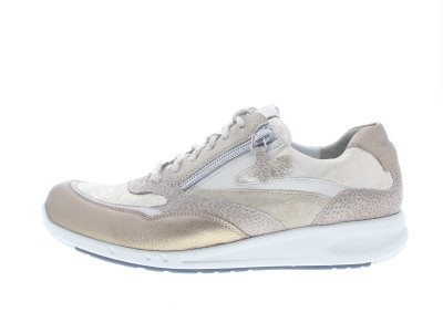 Durea GO sneaker, model 6306H. Voorzien van een Jill afwikkelzool. De speciale GO loopzool geeft sturing aan je voeten, zorgt voor een aangename afwikkeling en een stabiele looppatroon. Lopen op een GO kost daarom minder energie en dat geeft rust aan je voeten en een heerlijk vrije gevoel, ook ideaal bij hielspoorklachten. Licht taupe metallic leer met suède. Een functionele rits aan de laterale zijde voor meer aan- en uittrek comfort. Wijdte H, geschikt voor de iets bredere voet. Uitneembaar voetbed. Hakhoogte 40mm. Hielheffing 23mm. Impregneren met Collonil Carbon Pro