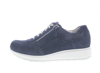 Durea casual dames sneaker, model 6312K+ op een Sophie verstijfde afwikkelzool voor extra loopcomfort door een versnelde afwikkeling. Blauw suède met een rits voor het instapgemak. Wijdte K+, geschikt voor de zeer brede voet. Dubbel uitneembare voetbed voor extra ruimte bij een zeer volle voet. Hakhoogte 40mm. Hielheffing 23mm.