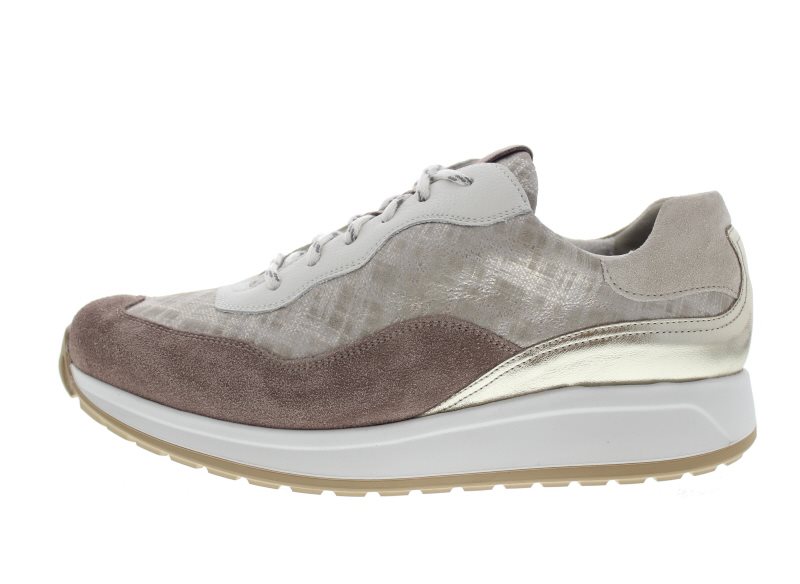 Durea dames sneaker, model 6319M op een dynamische Noor afrollende loopzool voor extra loopcomfort voor een betere sturing en balans. Aangenaam bij metatarsale klachten vanwege de dempende eigenschappen. Verlengd contrefort voor een goede hielstabiliteit. De hielheffing ondersteunt een geïrriteerde peesplaat en achillespees. Extra gepolsterde tong voor een compacte fit rond de wreef, zonder irritatie bij een hoge wreef. Functionele rits aan de laterale zijde. Taupe en roze suède. Wijdte M, geschikt voor de zeer brede voet. Uitneembaar voetbed. Hakhoogte 40mm. Hielheffing 23mm. Impregneren met Collonil Carbon Pro voor het beste resultaat