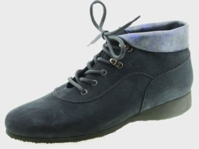 Schneider dames bootie, model 661-419C. Extreem smalle pasvorm voor de zeer smalle voet. Gemaakt van lichte materialen, waarnaast het onderwerk ook zeer flexibel is voor een soepele afwikkeling zonder beperkingen. Blauw nubuck leer. Uitneembaar voetbed.