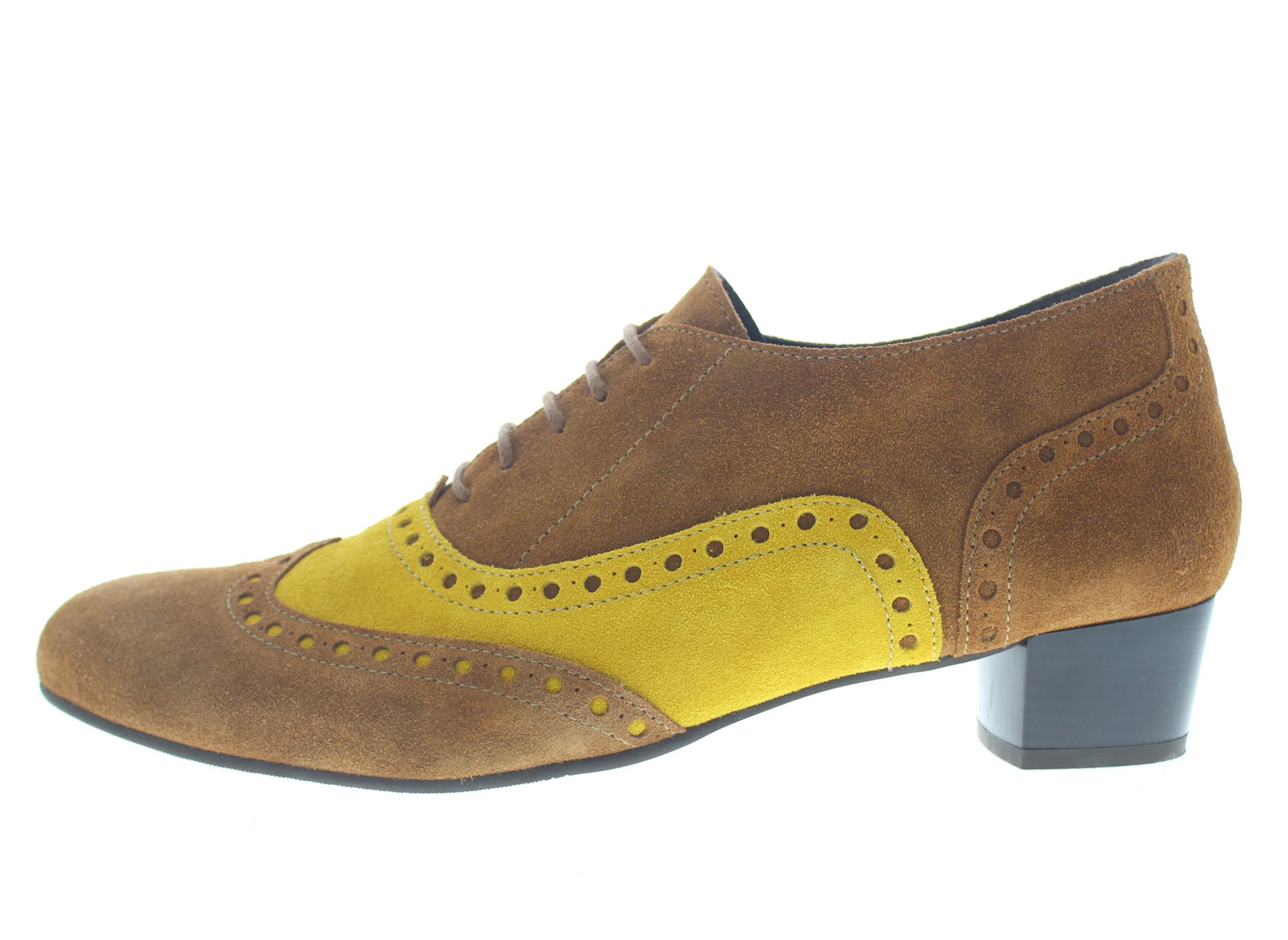 The Bird dames veterschoen op een hak, model 729C. Speciale smalle leest met een comfortabele pasvorm, steun in de hiel door een extra verlengd contrefort, en een stevige hak voor een stabiele houding. Cognac en geel suède. Wijdte C, geschikt voor de zeer smalle voet. Uitneembaar voetbed.