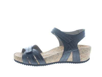 Deze mooie sandaal is uitgevoerd in zwart leer en is van het merk Durea. Het voetbed is van kurk gemaakt. De hakhoogte is 40 mm en de hieldrop is 22 mm