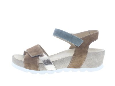 Durea elegante dames sandaal, model 7403H, met een extra dempende Wave slijtzool voor een neutrale, maar wel iets verstijfde afwikkeling. Lichtgewicht en antislip profiel. Geeft een stoere uitstraling onder een broek en een sjieke look onder een jurk of rok. Voorzien van twee klittenbandsluitingen voor een pasvorm die past bij jouw voeten, en een uitneembaar anatomisch gevormde voetbed met een lichte kuipvorm voor meer enkel en hielstabiliteit. Het bovenmateriaal is gemaakt van bruin met kaki/grijs suède leer en gouden details. Wijdte H, geschikt voor de iets bredere voet.