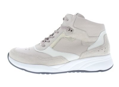 Enkelhoge dames sneaker van Durea, model 9778K op een Fleur afwikkelzool voor extra loopcomfort door een soepele ‘van hiel naar teen’ afrolling. Aangenaam bij metatarsale klachten door dempende eigenschappen. Verlengd contrefort voor een goede enkelstabiliteit, hoewel deze lager zit dan normaal, waardoor deze niet de enkel irriteert. De hielheffing ondersteunt een geïrriteerde peesplaat en achillespees. Extra gepolsterde tong voor een compacte fit rond de wreef, zonder irritatie bij een hoge wreef. Beige leer en suède. Wijdte K, geschikt voor de brede voet. Uitneembaar voetbed. Hakhoogte 40mm. Hielheffing 20mm. Impregneren met Collonil Carbon Pro voor het beste resultaat