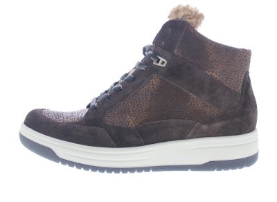 Durea casual enkelhoge dames sneaker, model 9781H. Voorzien van een licht verstijfde Tennis afwikkelzool met late teensprong en een neutrale afwikkeling. Ontlast peesplaat gerelateerde klachten, en de stevige contrefort zorgt voor een goede enkelstabiliteit. De hielheffing ondersteunt een geïrriteerde achillespees. Bruin leer met suède. Wijdte H, geschikt voor de normale tot iets bredere voet. Uitneembaar voetbed. Hakhoogte 45mm. Hielheffing 20mm. Impregneren met Collonil Carbon Pro voor het beste resultaat