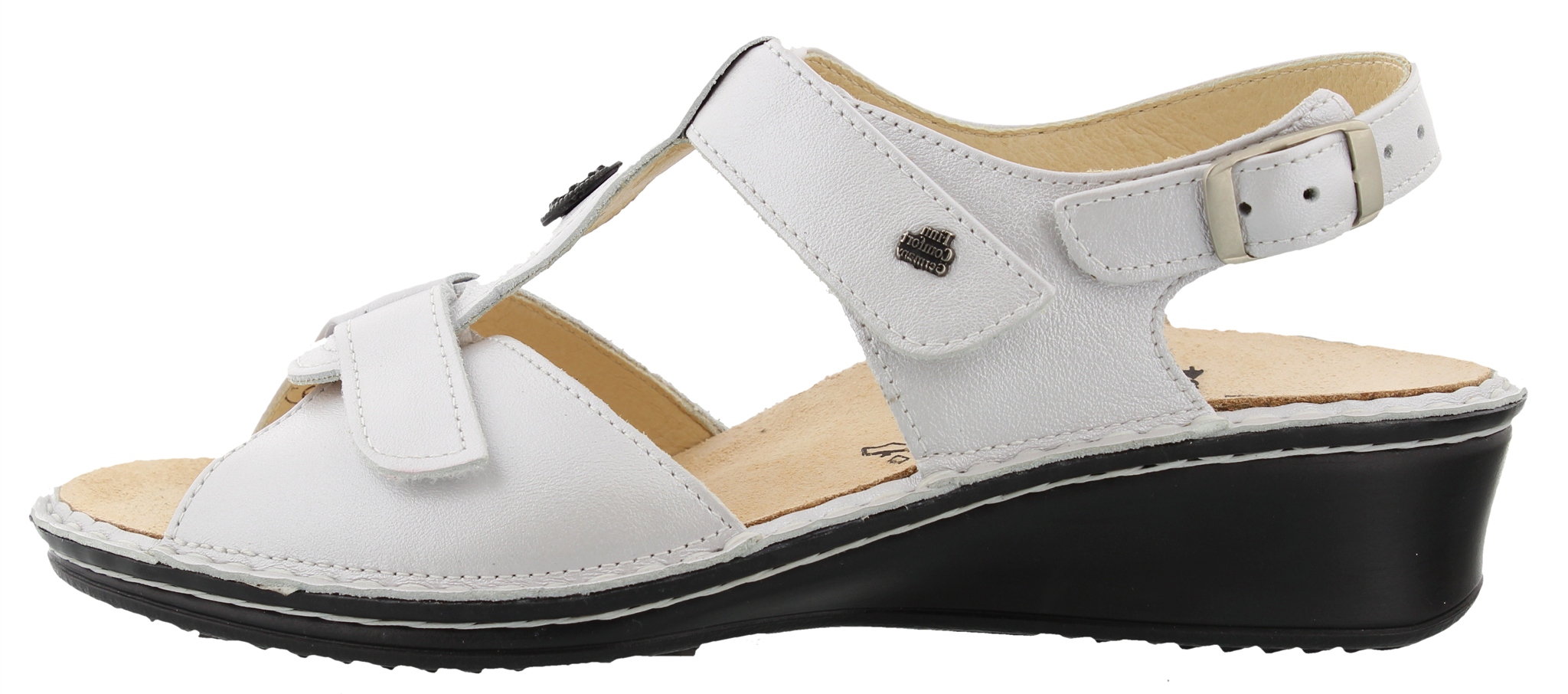 Finn Comfort dames sandaal met twee verstelbare klittenbanden en gespje bij de hiel, model Adana, wit gladleer, hakhoogte 28 mm. Uitneembaar voetbed. Wijdte G geschikt voor de smalle tot normale voet.