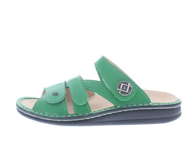 Finn Comfort dames slipper, model Agueda uit de Classic lijn. Groen leer, verstelbaar met drie klittenbandsluitingen, waarvan de wreefsluiting versierd is met een sierknop. Valt tussen een wijdte H en K, geschikt voor bredere voet. Uitneembaar ecologisch en anatomisch gevormde voetbed. Ook zeer goed te gebruiken als huisslipper.