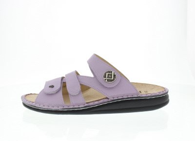 Finn Comfort dames slipper, model Agueda uit de Classic lijn. Verstelbaar met drie klittenbandsluitingen, met een sierknop op de wreefband. Lila reliëf leer. Valt als een wijdte H, geschikt voor de gemiddelde voet. Uitneembaar ecologisch en anatomisch gevormde voetbed. Ook zeer goed te gebruiken als huisslipper.