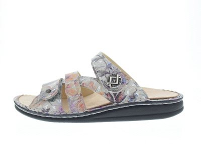Finn Comfort dames slipper, model Agueda uit de Classic lijn. Verstelbaar met drie klittenbandsluitingen, met een sierknop op de wreefband. Multicolor nubuck. Valt als een wijdte H, geschikt voor de gemiddelde voet. Uitneembaar ecologisch en anatomisch gevormde voetbed. Ook zeer goed te gebruiken als huisslipper.