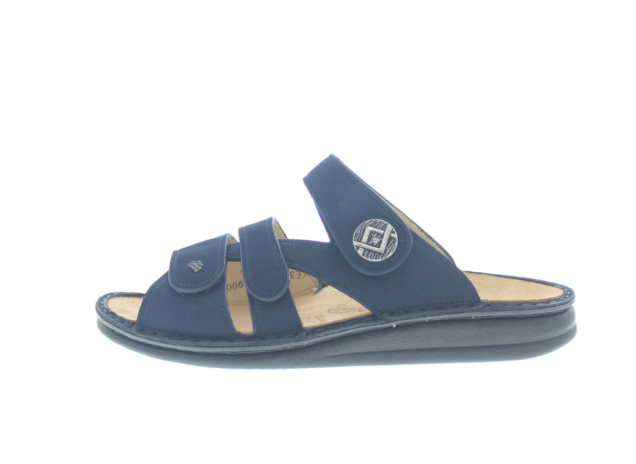 Finn Comfort dames slipper, model Agueda uit de Classic lijn. Blauw nubuck. Verstelbaar met drie klittenbandsluitingen, waarvan de wreefsluiting versierd is met een sierknop. Valt tussen een wijdte H en K, geschikt voor bredere voet. Uitneembaar ecologisch en anatomisch gevormde voetbed. Ook zeer goed te gebruiken als huisslipper.