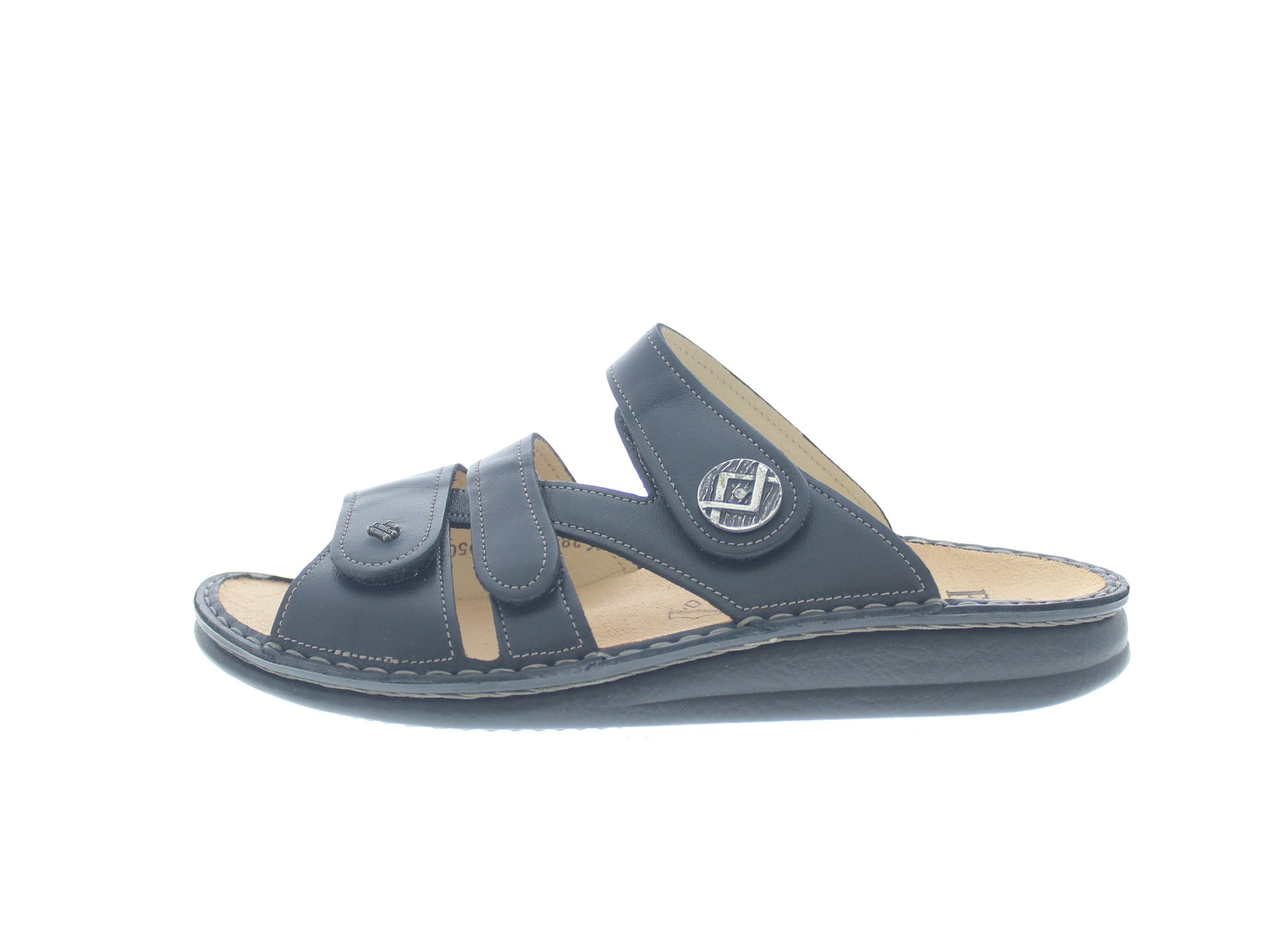 Finn Comfort dames slipper, model Agueda uit de Classic lijn. Zwart leer. Verstelbaar met drie klittenbandsluitingen, waarvan de wreefsluiting versierd is met een sierknop. Valt tussen een wijdte H en K, geschikt voor bredere voet. Uitneembaar ecologisch en anatomisch gevormde voetbed. Ook zeer goed te gebruiken als huisslipper.