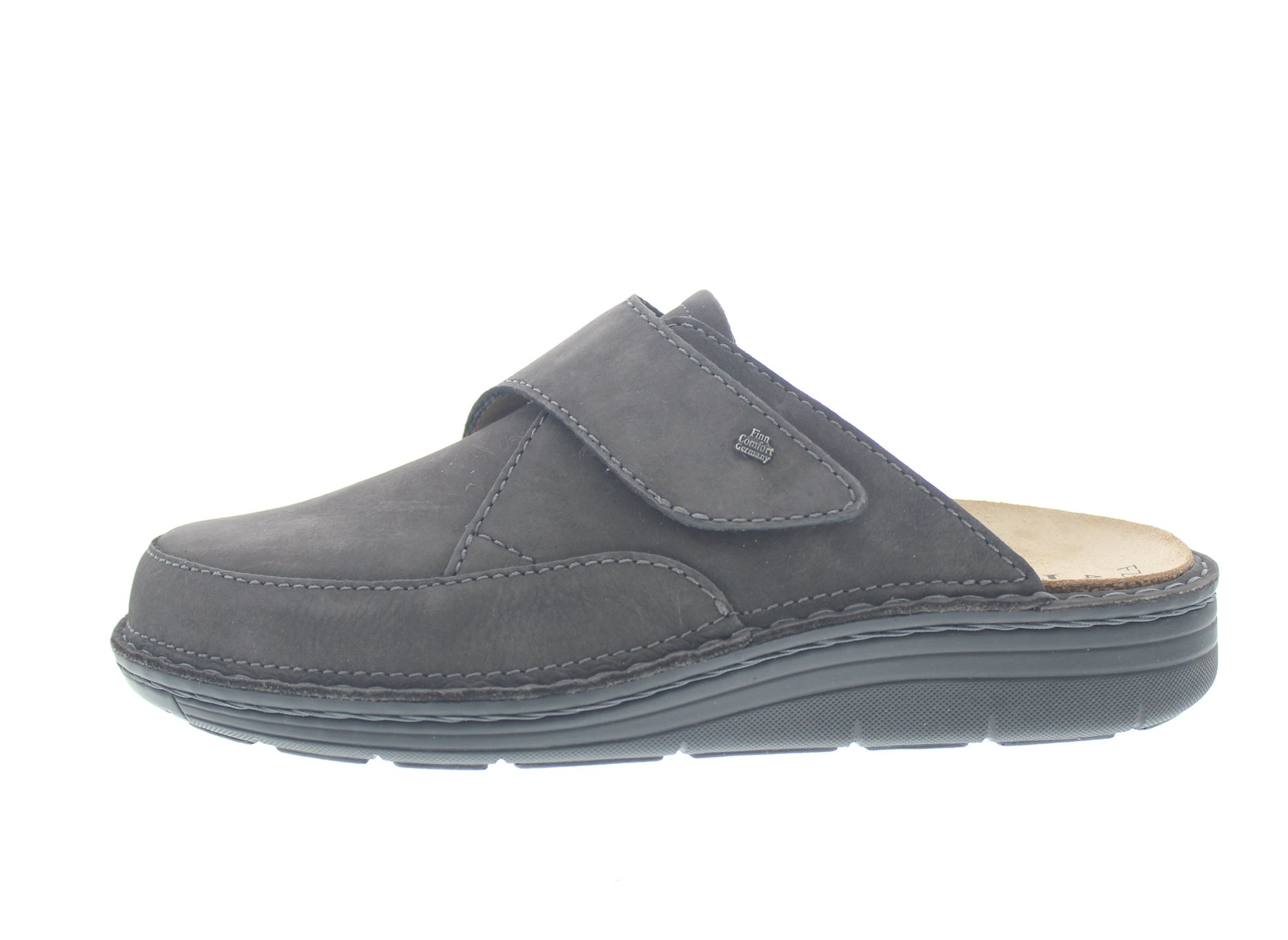 Finn Comfort heren muil, model Aguilas uit de FinnPlus lijn. Extra breed, valt als een wijdte M, geschikt voor de brede voet. Verstelbaar met een enkele overslag klittenbandsluiting om de gewenste wreefsluiting te bepalen. Grijs geolied nubuck. Uitneembaar ecologisch en anatomisch gevormde voetbed. Ideaal voor buiten maar ook voor het gebruik binnenshuis als huisschoen/pantoffel.
