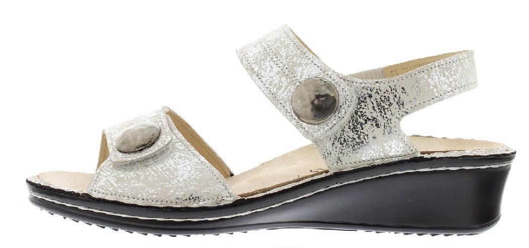 Finn Comfort dames sandaal met twee verstelbare klittenbanden, model Alanya, zilver leer, uitneembaar voetbed, hakje 28 mm, uitneembaar voetbed. Geschikt voor de normale voet.