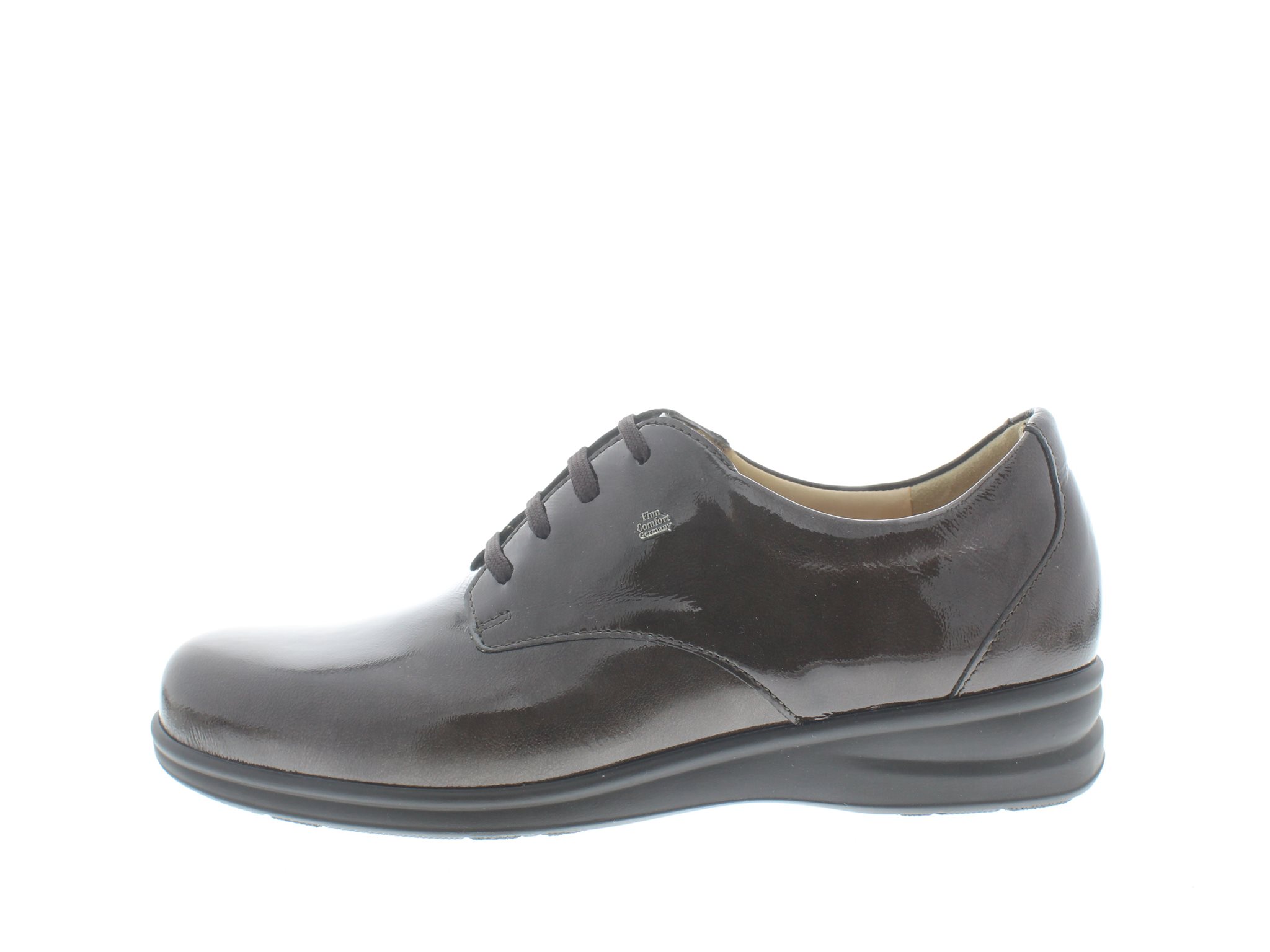 Finn Comfort dames veterschoen, model Albacete uit de FinnSlim lijn, bruin lakleer, wijdte valt tussen een G en J, geschikt voor de normale en iets smallere voet, uitneembaar voetbed.