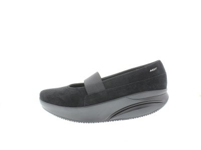 MBT bandschoenen, model Aleela, zwart nubuckleer, uitneembaar voetbed, elastiek over de wreef voor betere pasvorm. Performance afrolzool (level 3). Deze afrolzool is de meest instabiele MBT zool die minder geschikt is als je veel moet staan. Uitermate geschikt als je veel gaat lopen.