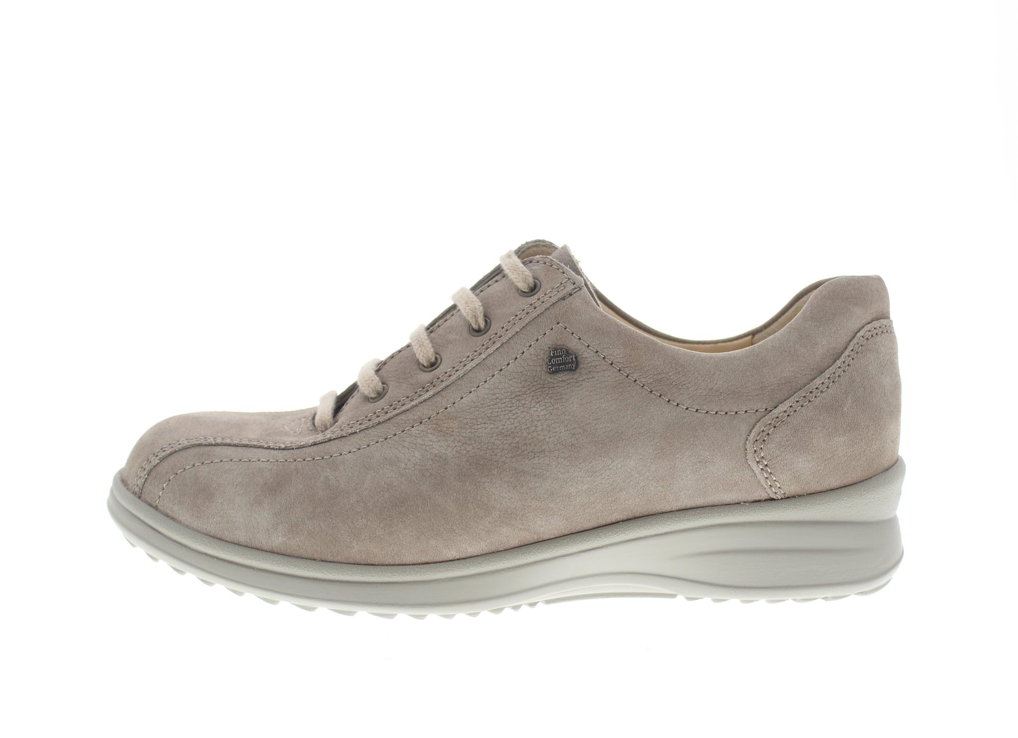 Finn Comfort dames veterschoen, model Almeria uit de LadyLine. Voorzien van een soepele loopzool met een antislip profiel en een stevig contrefort voor extra hielstabiliteit. Goede pasvorm bij een hoge wreef, hoewel de minimalistische look een slanke uitstraling heeft. Beige gevlamd nubuck leer. Valt als een wijdte K met een meer toegeknepen hielslot ten opzichte van een bredere balwijdte. Geschikt voor de brede voet. Uitneembaar ecologisch en anatomisch gevormde voetbed. Finn Comfort inlegzolen zijn los verkrijgbaar.