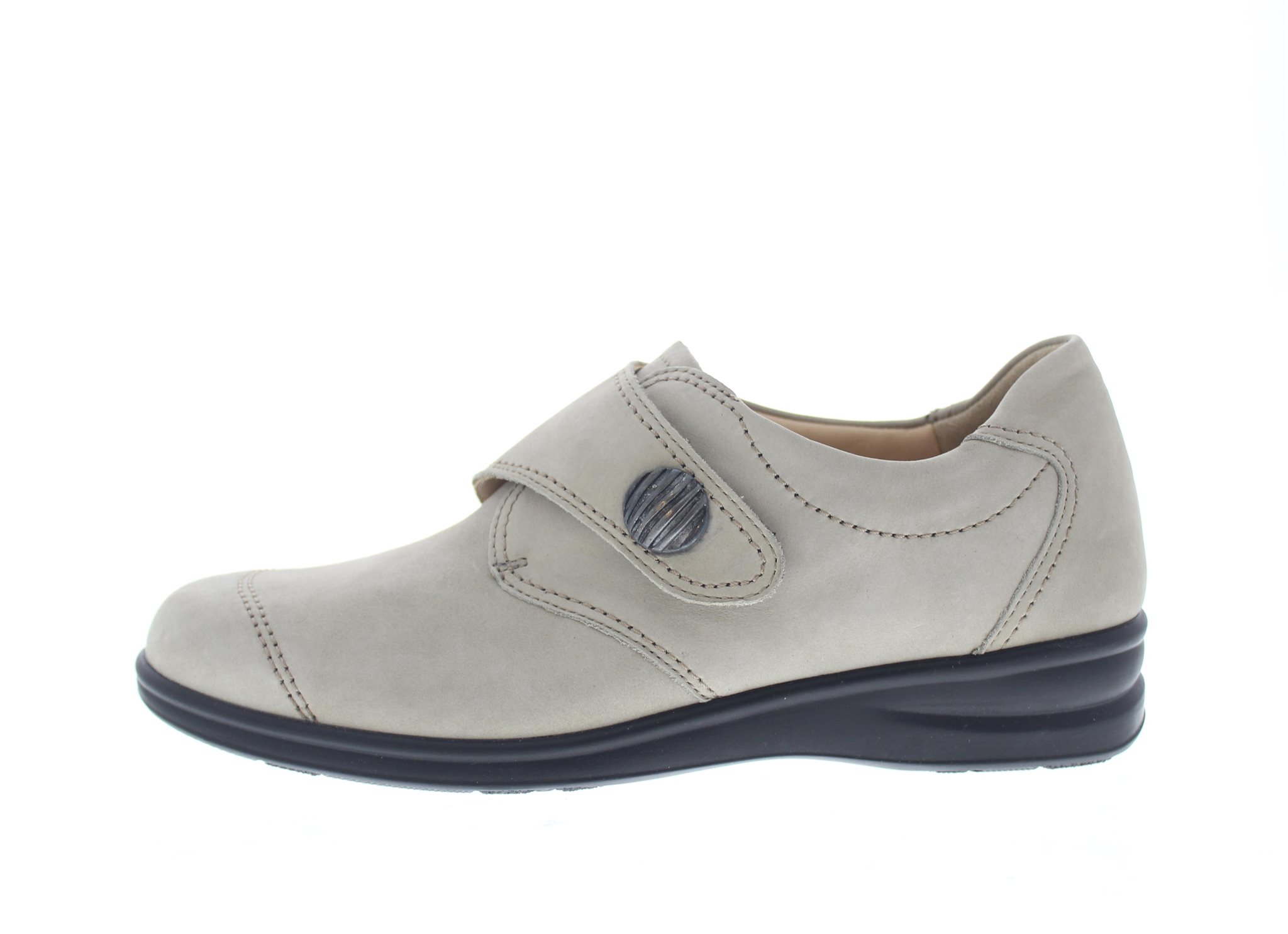 Finn Comfort dames klittenbandschoen, model Alzano uit de FinnSlim lijn. Voorzien van een flexibele loopzool. Steen grijs nubuck. Valt als een wijdte G. Geschikt voor de normale voet. Uitneembaar ecologisch en anatomisch gevormde voetbed. Finn Comfort inlegzolen zijn los verkrijgbaar. Hakhoogte 40mm. Hielheffing 18mm.