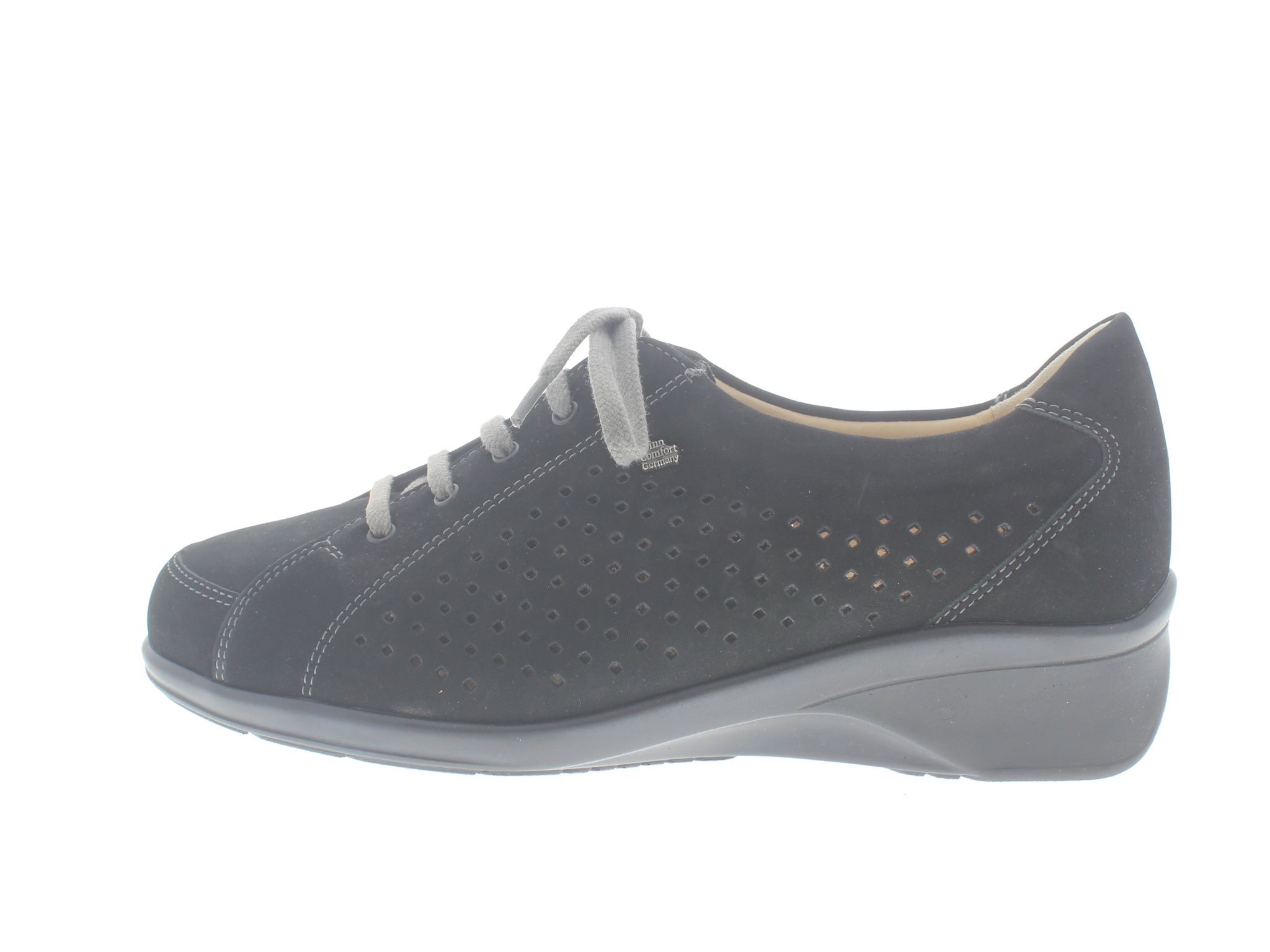 Finn Comfort dames veterschoen, model Antibes uit de City lijn. Dit model is een variant op de Amsterdam met geperforeerde flanken. Voorzien van een flexibele zool met een hakverhoging voor een betere rugpositie. Zwart nubuck leer. Valt als een wijdte H, geschikt voor de normale tot bredere voet, uitneembaar ecologisch en anatomisch gevormde voetbed. Finn Comfort inlegzolen zijn los verkrijgbaar.