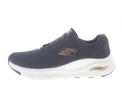 Skechers dames super lichtgewicht lifestyle veterschoen, model Arch Fit Big Appeal, zwart geweven en luchtdoorlatend boven materiaal zonder leer elementen, Vegan verantwoord, valt als een wijdte G tot H, geschikt voor de normale tot iets bredere voet. Dit model heeft een uitneembaar voetbed wat wel een focus heeft op het geven van steun in de voetboog, het onderwerk zorgt voor een aangenaam dynamische afwikkeling. Ook geschikt bij een geïrriteerde achillespees en peesplaat, en zeer comfortabel bij een hallux valgus/bunion.