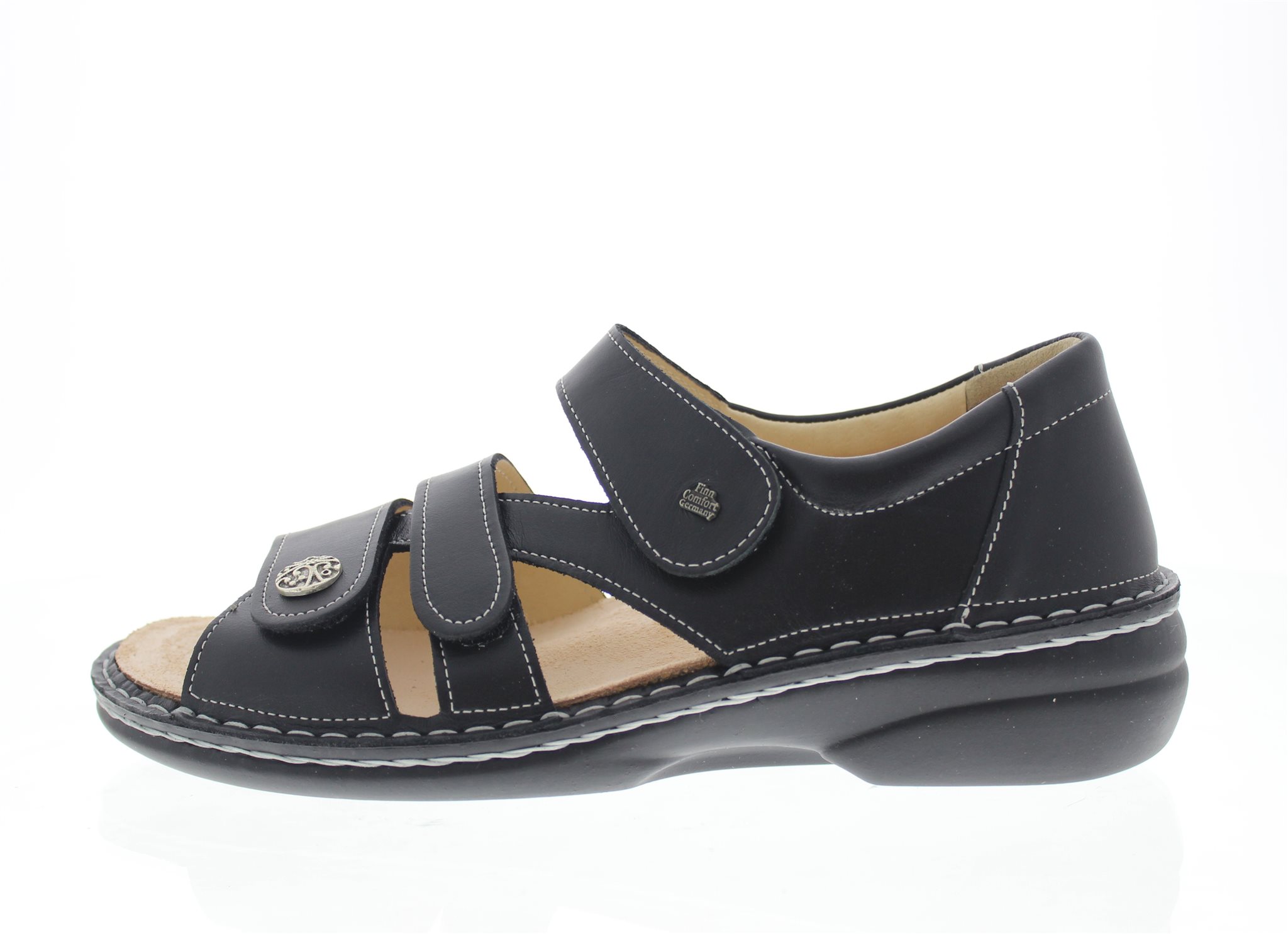 Finn Comfort dames sandaal met dichte hiel en drie verstelbare klittenbanden, model Biella-S uit de Classic-Soft lijn. Zwart glad leer. Valt als een wijdte K, geschikt voor de brede voet. Uitneembaar ecologisch en anatomisch gevormde voetbed met een zachte toplaag die je eigen voetafdruk aanneemt.