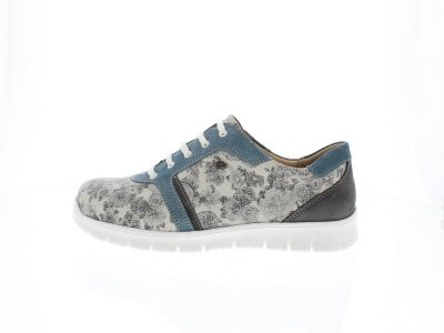 Finn Comfort dames veterschoen, model Biscaya uit de FinnRelax lijn. Voorzien van een lichtgewicht flexibele loopzool met dempende eigenschappen. Grijs nubuck leer met blauw en grijze details. Valt als een wijdte H, geschikt voor de normale tot iets bredere voet. Uitneembaar ecologisch en anatomisch gevormde voetbed. Hakhoogte 30mm. Hielheffing 12mm.