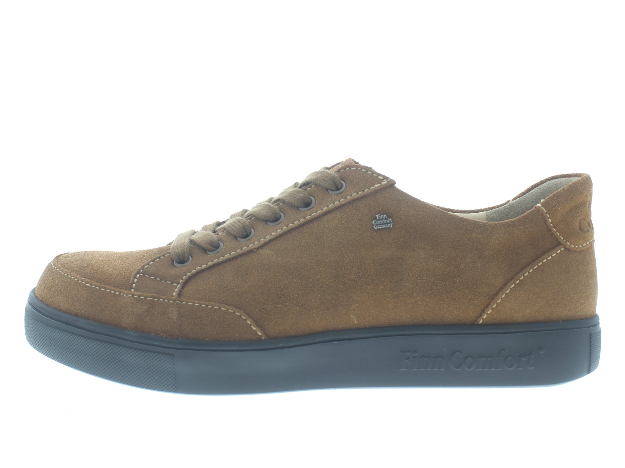 Finn Comfort casual heren veterschoen, model Brandon uit de CitySport lijn in een minimalistische stijl voor alledaags gebruik. Voorzien van een lichtgewicht dempende loopzool. Deze is vrij flexibel met weinig afwikkeling, waardoor je de autonomie over je eigen afwikkelpatroon behoud en de spierkracht van je voeten traint. Cognac suède leer. Valt tussen een wijdte G en H, geschikt voor de normale tot iets bredere voet. Uitneembaar ecologisch en anatomisch gevormde voetbed.