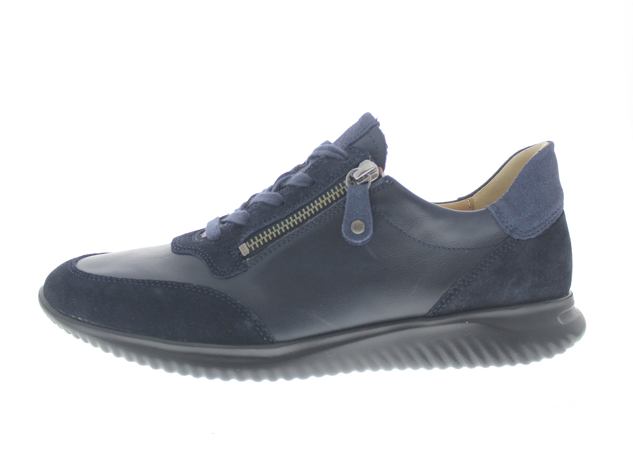 Hartjes modieuze sneaker, model Breeze met een dubbele rits voor het instapgemak. Blauw leer met suède details. De Breeze heeft een snelle teensprong voor een dynamische afwikkeling en extreem lichtgewicht. Wijdte G met iets meer toegift rond de balwijdte, geschikt voor de normale tot iets bredere voet. Uitneembaar voetbed. Dit model is chroomarm. Hakhoogte 35mm.