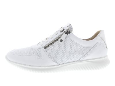 Hartjes modieuze sneaker, model Breeze 1 met een laterale rits voor het instapgemak. Wit glad leer met geperforeerde elementen. De Breeze heeft een snelle teensprong voor een dynamische afwikkeling en is extreem lichtgewicht. Wijdte G met iets meer toegift rond de balwijdte, geschikt voor de normale tot iets bredere voet, uitneembaar voetbed. Dit model is chroomarm. Hakhoogte 35mm.