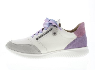 Hartjes modieuze sneaker, model Breeze met een laterale rits voor het instapgemak. Roomwit leer met paars suède. De Breeze heeft een snelle teensprong voor een dynamische afwikkeling en is extreem lichtgewicht. Wijdte G met iets meer toegift rond de balwijdte, geschikt voor de normale tot iets bredere voet, uitneembaar voetbed. Dit model is chroomarm. Hakhoogte 35mm. Hielheffing 20mm. Impregneren met Collonil Carbon Pro voor de beste bescherming