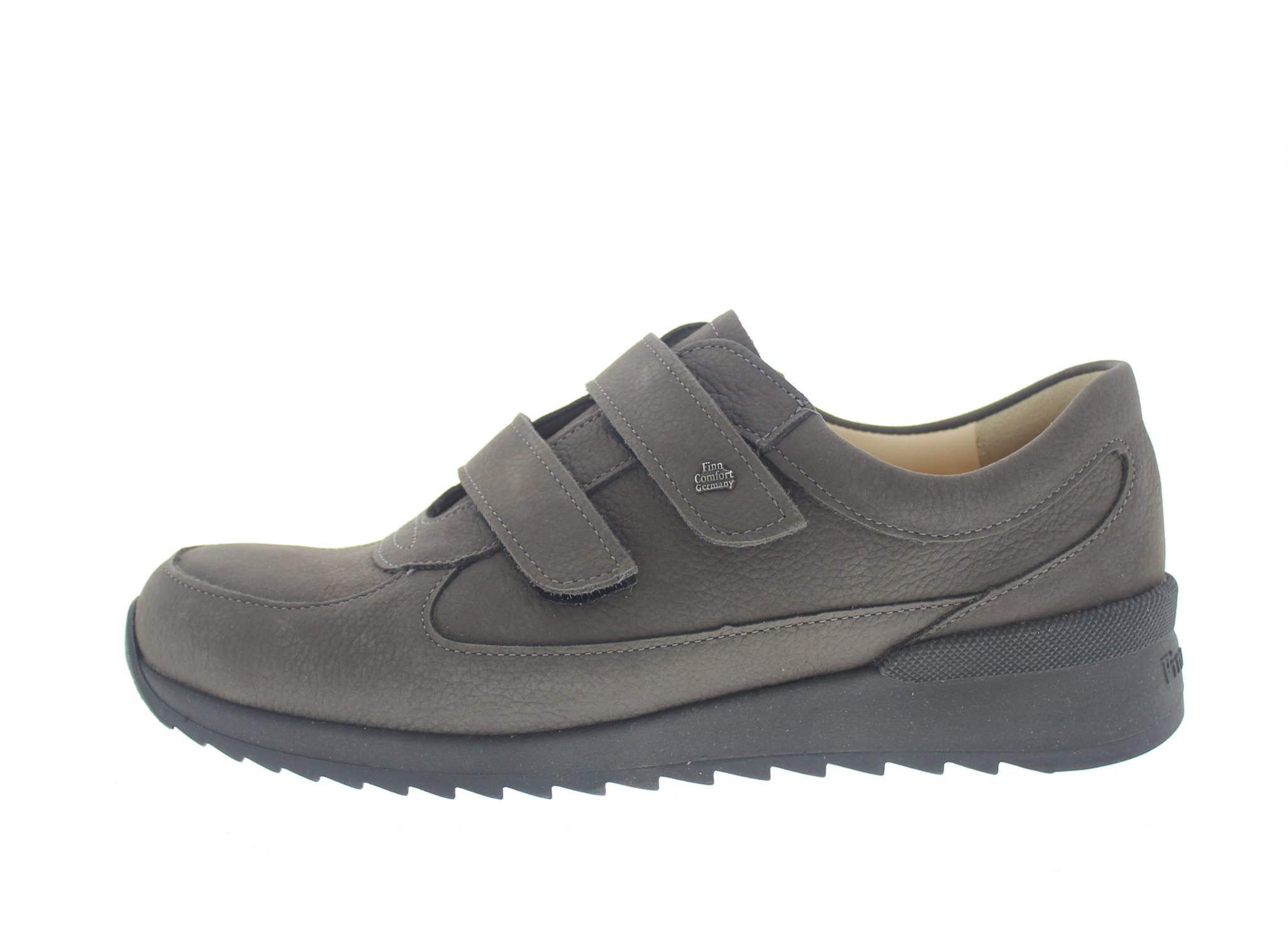Finn Comfort dames klittenbandschoen, model Brenzone uit de CitySport lijn. Casual style sneaker met een dubbele klittenbandsluiting. Soepele afwikkelzool met een stevig profiel. Grijs nubuck. Valt als een wijdte H, geschikt voor de normale tot iets bredere voet. Uitneembaar ecologisch en anatomisch gevormde voetbed. Hakhoogte 30mm. Hielheffing 18mm. Onderhoudsadvies: Collonil Carbon Pro