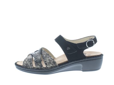 Finn Comfort elegante dames sandaal, model Buka uit de City lijn, zwart nubuck leer, klittenbandsluitingen op de wreef en een verschuifbare sluiting op de voorvoet, de hielsluiting is verstelbaar met een gesp en een drukknop voor meer gebruiksgemak, valt tussen een wijdte G en H, geschikt voor de normale tot iets bredere voet.