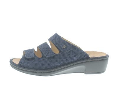 Finn Comfort dames slipper, model Canzo uit de City lijn. Voorzien van drie verstelbare klittenbandsluitingen op de voet om te verstellen naar de gewenste sluiting. Dichte flanken voor extra support, en een hielkuip in het voetbed voor een stabielere enkelstand. Blauw nubuck met een patroon en een metallic finish. Valt tussen een wijdte G en H, geschikt voor de iets bredere voet. Uitneembaar ecologisch en anatomisch gevormde voetbed. Hakhoogte 40mm. Hielheffing 28mm