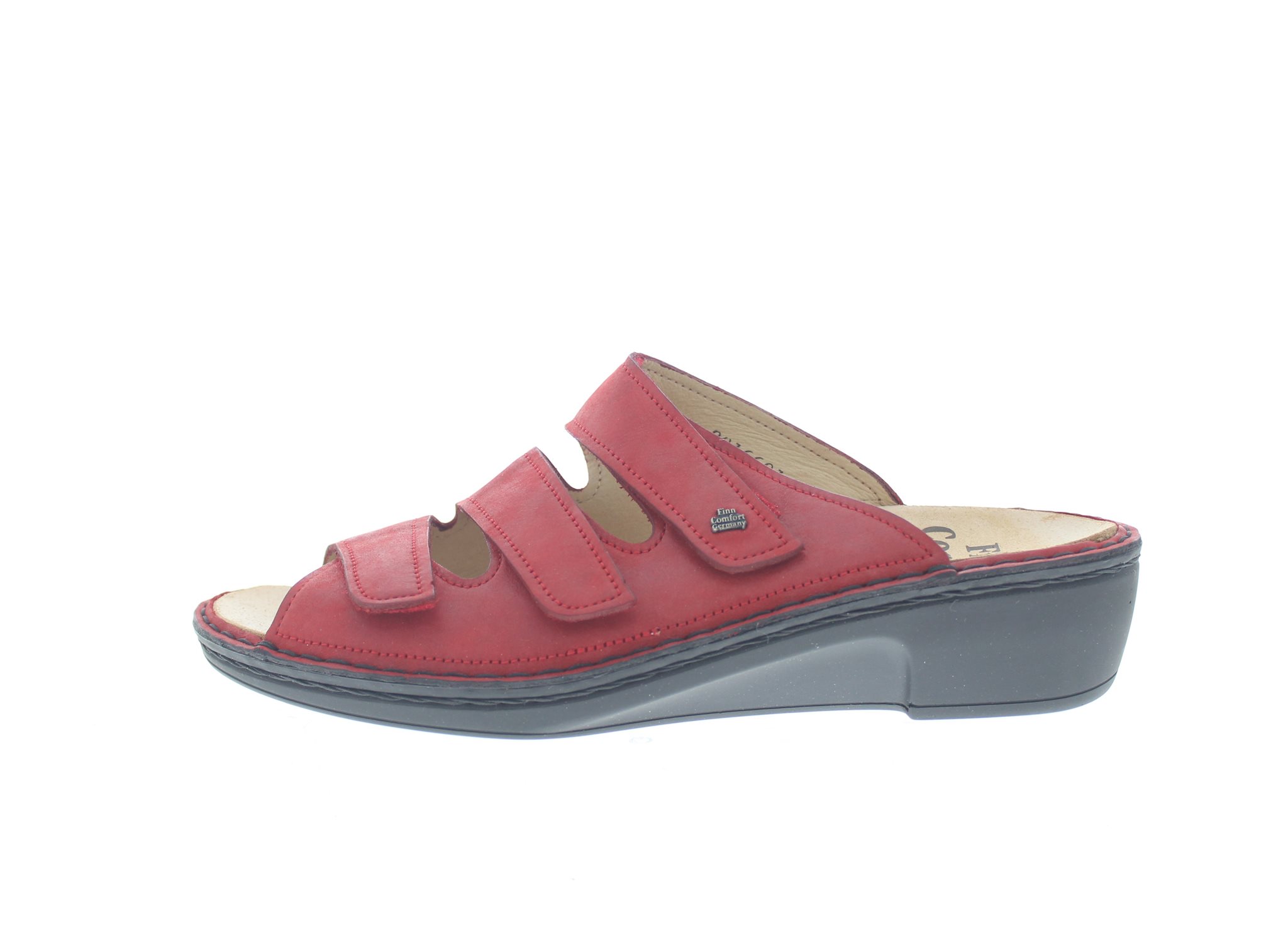 Finn Comfort dames slipper, model Canzo uit de City lijn. Voorzien van drie verstelbare klittenbandsluitingen op de voet om te verstellen naar de gewenste sluiting. Dichte flanken voor extra support, en een hielkuip in het voetbed voor een stabielere enkelstand. Rood leer met een glimmende finish. Valt tussen een wijdte G & H, geschikt voor de normale tot iets bredere voet. Uitneembaar ecologisch en anatomisch gevormde voetbed. Hakhoogte 40mm. Hielheffing 28mm