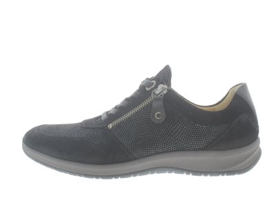 Hartjes casual sneaker, model Care SF met een functionele rits. Een speciale smalle leest met een lekkere afwikkelzool dat niet te stug noch te slap is. De licht gepolsterde hielsluiting zorgt voor een goede aansluiting rondom de hiel. Chroomarme binnenvoering. Zwart suède. Wijdte D, geschikt voor de smalle voet. Uitneembaar voetbed.