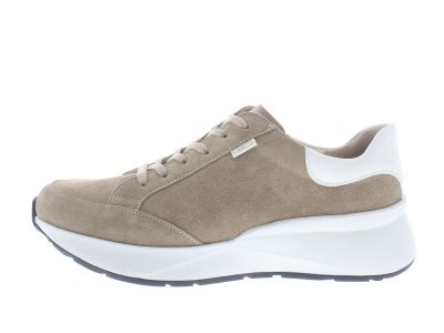 Finn Comfort dames sneaker met een chunky afwikkelzool, model Caseres uit de CitySport lijn. Voorzien van een mediale rits voor het instap gemak. Taupe suède leer met witte details. Valt tussen een wijdte H en K, geschikt voor de iets bredere voet. Uitneembaar ecologisch en anatomisch gevormde voetbed. De buitenzool heeft dempende eigenschappen en wikkelt heerlijk af, ideaal bij gevoelige voorvoeten en afwikkelproblemen. Ook geschikt bij een peesplaat ontsteking of bij een hallux limitus. Hakhoogte 40mm. Hielheffing 15mm. Impregneren met Collonil Carbon Pro voor het beste resultaat.
