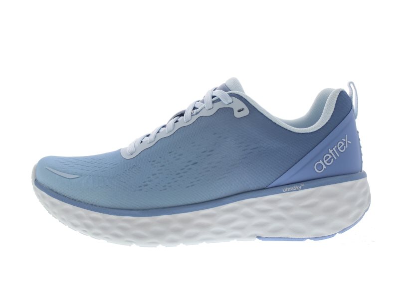 Aetrex dames lichtgewicht lifestyle sneaker, model Danika. Licht blauw synthetisch materiaal. Valt tussen een wijdte G en H, geschikt voor de iets bredere voet. Uitneembaar voetbed. Het onderwerk zorgt voor een aangenaam dynamisch en schokdempende afwikkeling. Geschikt bij een geïrriteerde peesplaat, achillespees en hielspoor. De dempende afwikkelzool heeft een goede grip en tractie. Ook geschikt bij gelimiteerde afwikkelklachten van de grote teengewricht, hallux valgus en bunion.