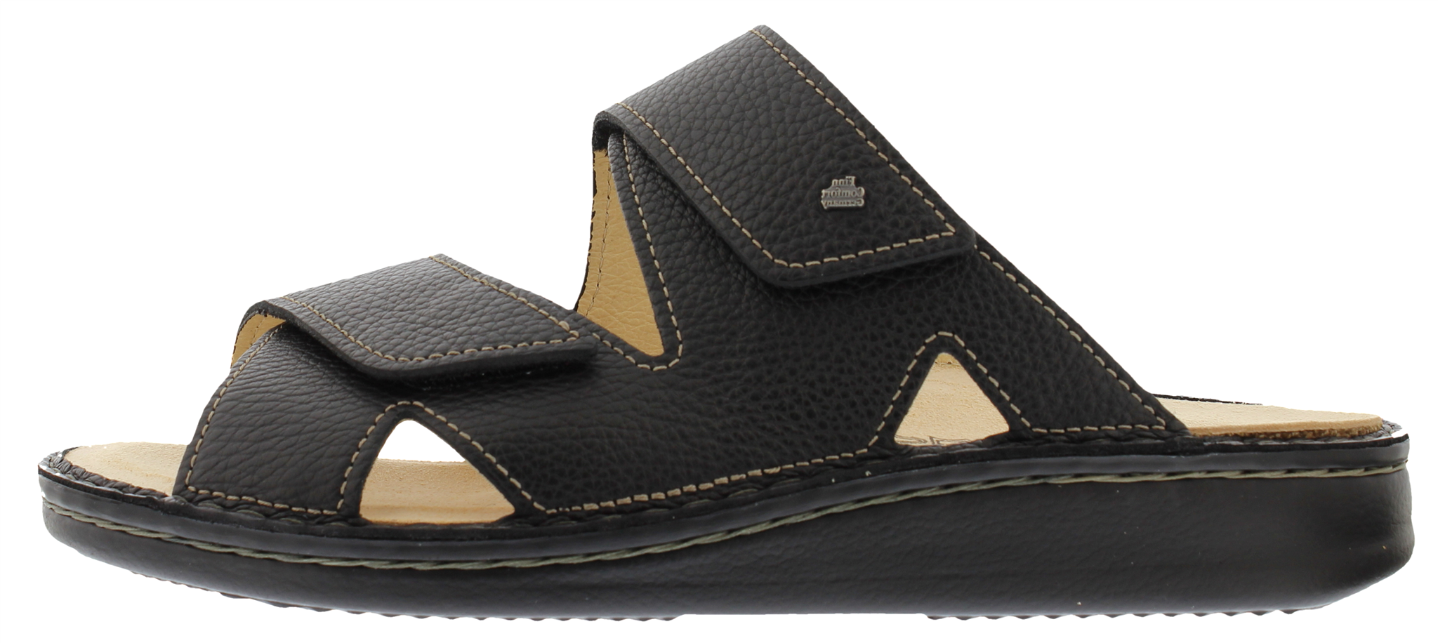 Finn Comfort slipper met twee verstelbare klittenbanden, model Danzig-S, wijdte K geschikt voor de bredere voet. Zwart gladleer met uitneembaar voetbed. Hakhoogte 12 mm.