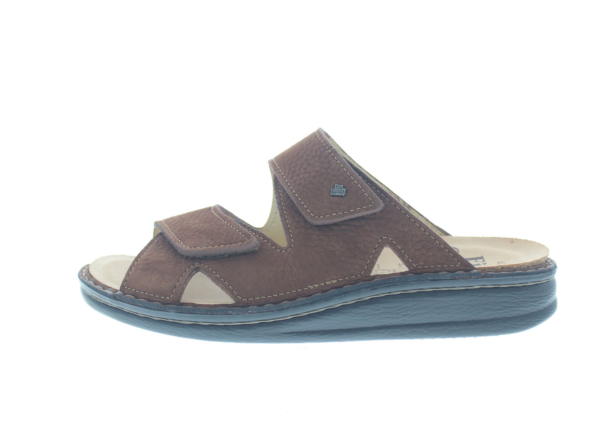 Finn Comfort heren slipper, model Danzig-S uit de ClassicSoft lijn. Dit model is voorzien van een extra dempende inlegzool, ideaal bij gevoelige voeten. Bruin reliëf nubuck. Twee verstelbare klittenbandsluitingen op de voet met semi dichte flanken voor meer middenvoet support. Valt als een wijdte K, geschikt voor de bredere voet, maar door de verstelbare banden ook te dragen als een H wijdte. Uitneembaar ecologisch en anatomisch gevormde voetbed.