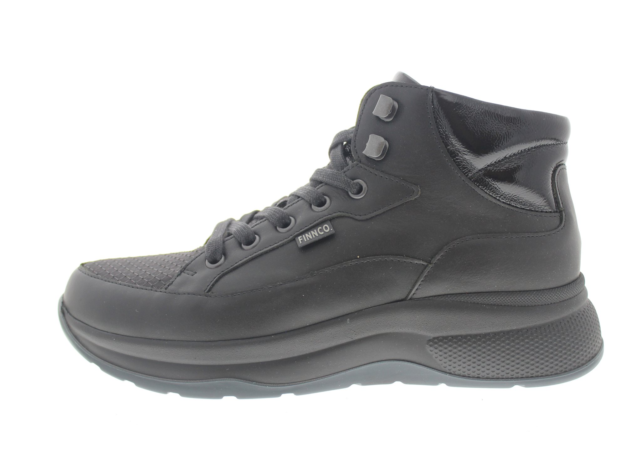 Finn Comfort robuuste dames enkelhoge sneaker met een chunky afwikkelzool, model Daytona uit de TrendLine. Zwart leer met synthetische details. Valt als een wijdte H, geschikt voor de iets bredere voet. Uitneembaar ecologisch en anatomisch gevormde voetbed. De buitenzool heeft dempende eigenschappen en wikkelt heerlijk af, ideaal bij gevoelige voorvoeten en peesplaat gerelateerde klachten.