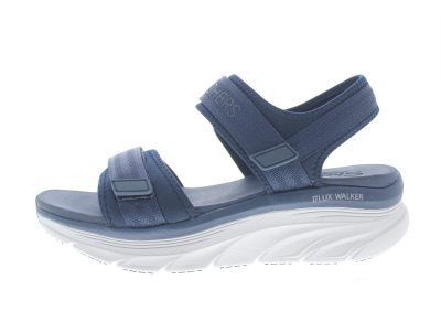 Skechers dames sandaal, model D’LUX Walker. Sportieve sandaal met een binnenvoering van sneldrogend sportmateriaal en verstelbaar met twee klittenbandsluitingen. Schokabsorberend vast voetbed met een stevig antislip profiel van de loopzool. Ideaal bij gelimiteerde afwikkelklachten van de grote teengewricht. De demping in de hiel in combinatie met de hielheffing helpt bij het bestrijden van hielspoor en andere pees gerelateerde klachten. Volledig synthetisch met blauw als hoofdkleur. Gemiddelde pasvorm, meer in de richting van een wijdte H, geschikt voor de iets bredere voet. Hakhoogte 55mm. Hielheffing 20mm.